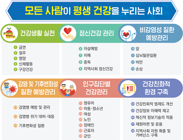 - 학교 교육: 초등학교부터 대학까지 연령에 맞춘 건강 정보 교육