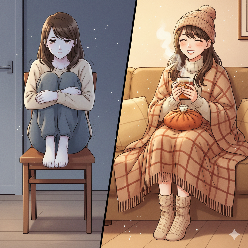 - 방법: 집안에서도 양말과 슬리퍼를 꼭 착용하고, 외출 시에는 보온성이 좋은 장갑을 착용합니다. 몸 전체의 체온 유지를 위해 내복이나 히트텍을 착용하는 습관을 들입니다.