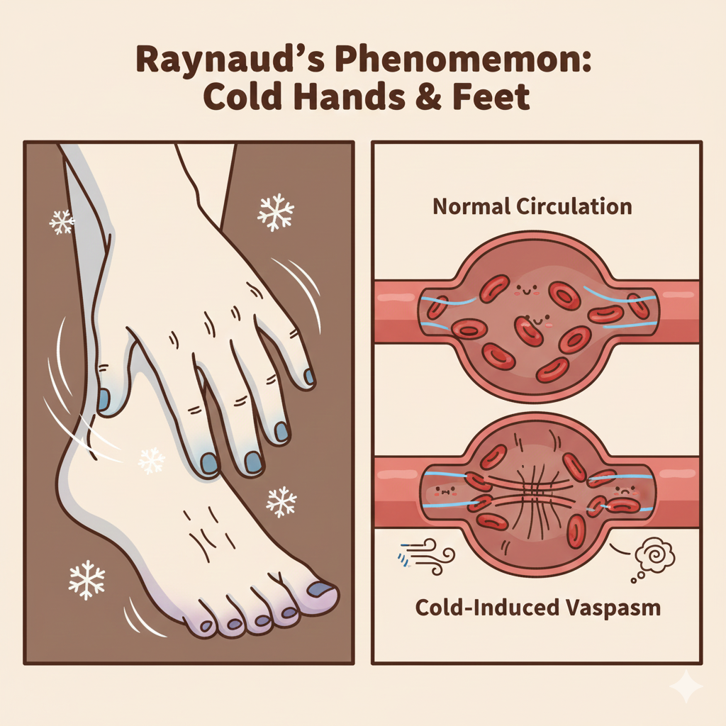 - 약물 부작용: 일부 고혈압 약(베타 차단제), 편두통 약 등은 혈관 수축을 유발하여 수족냉증을 악화시킬 수 있습니다.