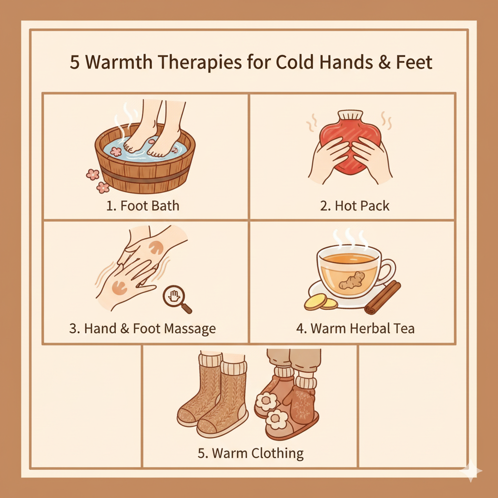 따뜻한 족욕/반신욕, 핫팩과 찜질팩, 꾸준한 마사지, 몸을 따뜻하게 하는 차 섭취, 그리고 보온 의류 착용 이 다섯 가지는 여러분의 손발을 따뜻하게 해주고, 전신 혈액순환을 개선하는 데 큰 도움이 될 것입니다.