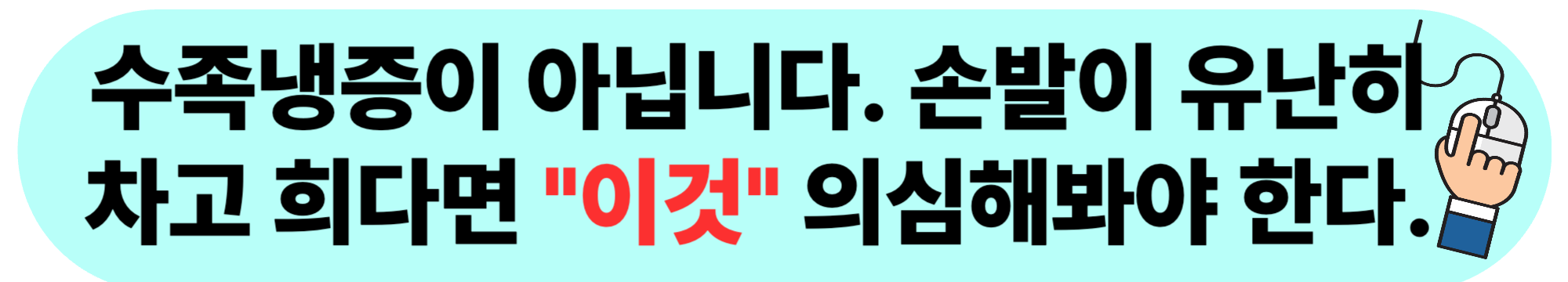 - 특정 질환: 류마티스성 질환(레이노병, 루푸스, 경피증 등), 갑상선 기능 저하증, 당뇨병 등의 기저 질환이 있는 경우 수족냉증이 동반될 수 있습니다.