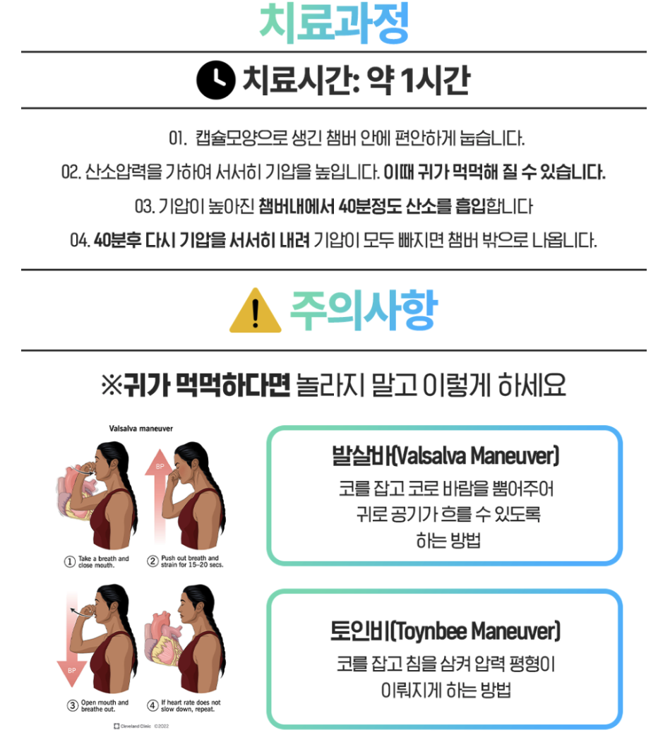 - 고압산소케어는 대부분 안전하지만, 폐 질환이 있는 경우 치료 전 반드시 전문의와 상담해야 합니다.
