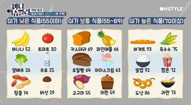 | 저GI 음식 | 중간 GI | 고GI (주의) |