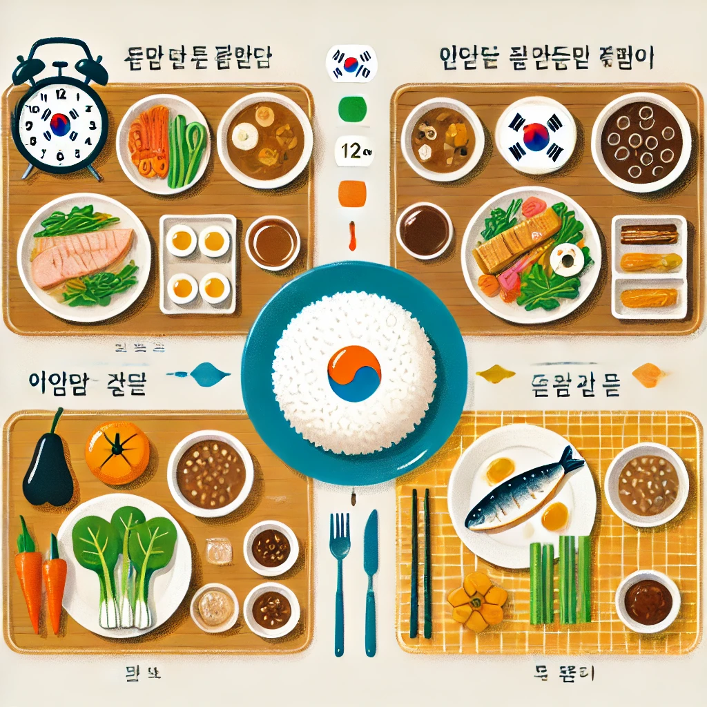 | 월 | 귀리죽 + 삶은 달걀 | 보리밥 + 된장국 + 두부조림 | 고등어구이 + 상추쌈 + 현미밥 |
