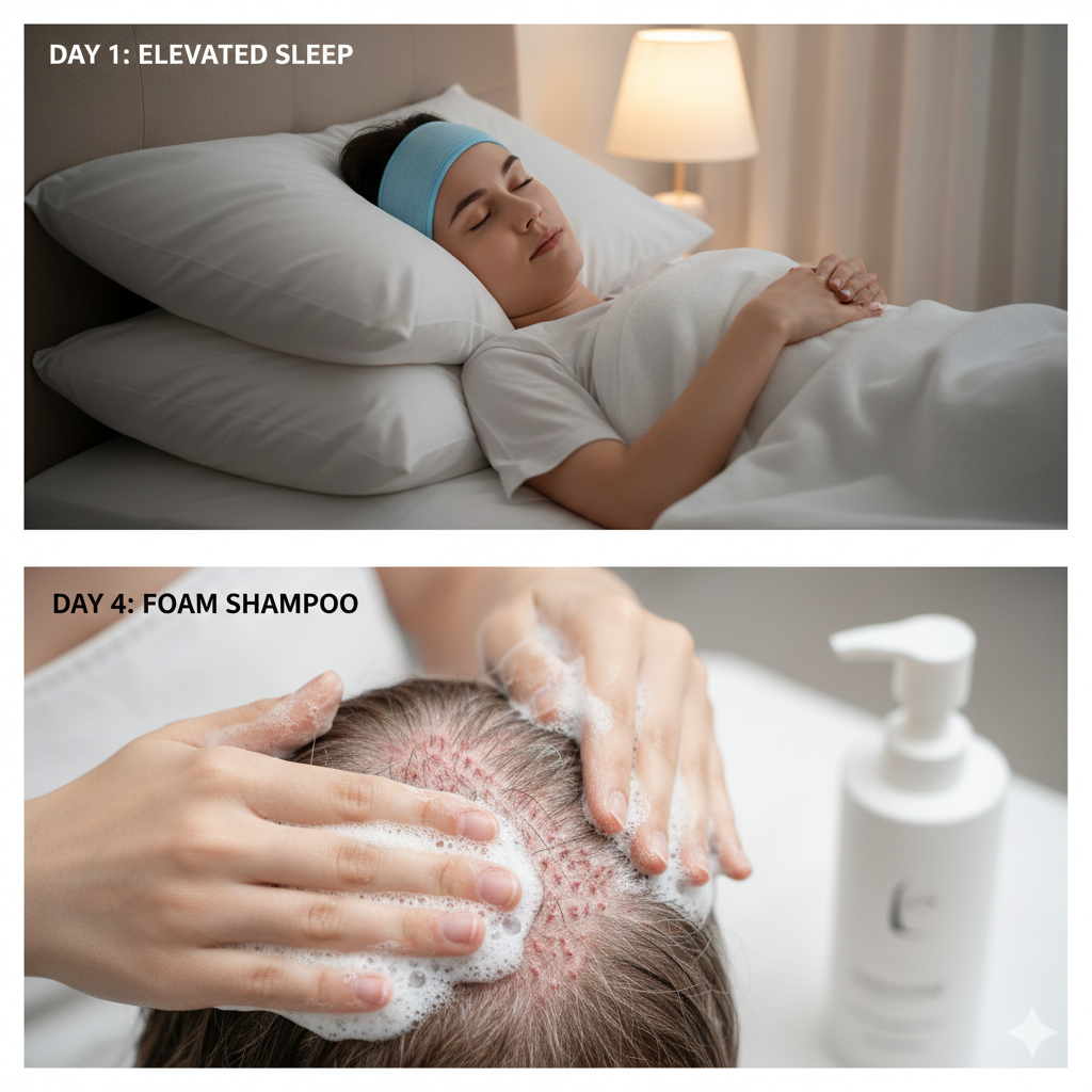- 거품 샴푸: 지문을 이용해 톡톡 두드리는 방식의 세안을 해야 합니다. 딱지를 억지로 떼어내면 모낭이 같이 빠질 수 있습니다.