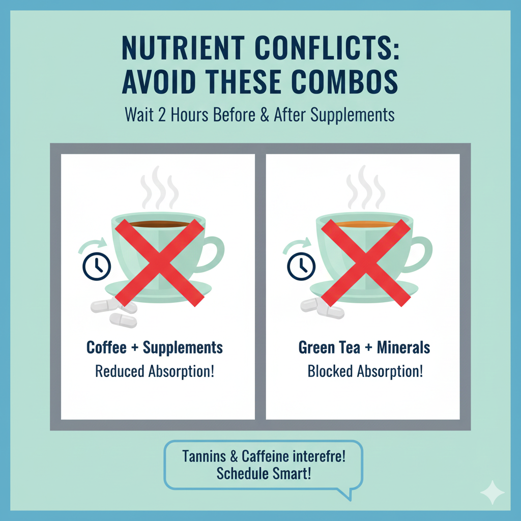- 종합비타민과 녹차/커피: 차에 든 탄닌 성분은 비타민의 미네랄 성분과 결합하여 소변으로 배출시켜 버립니다.