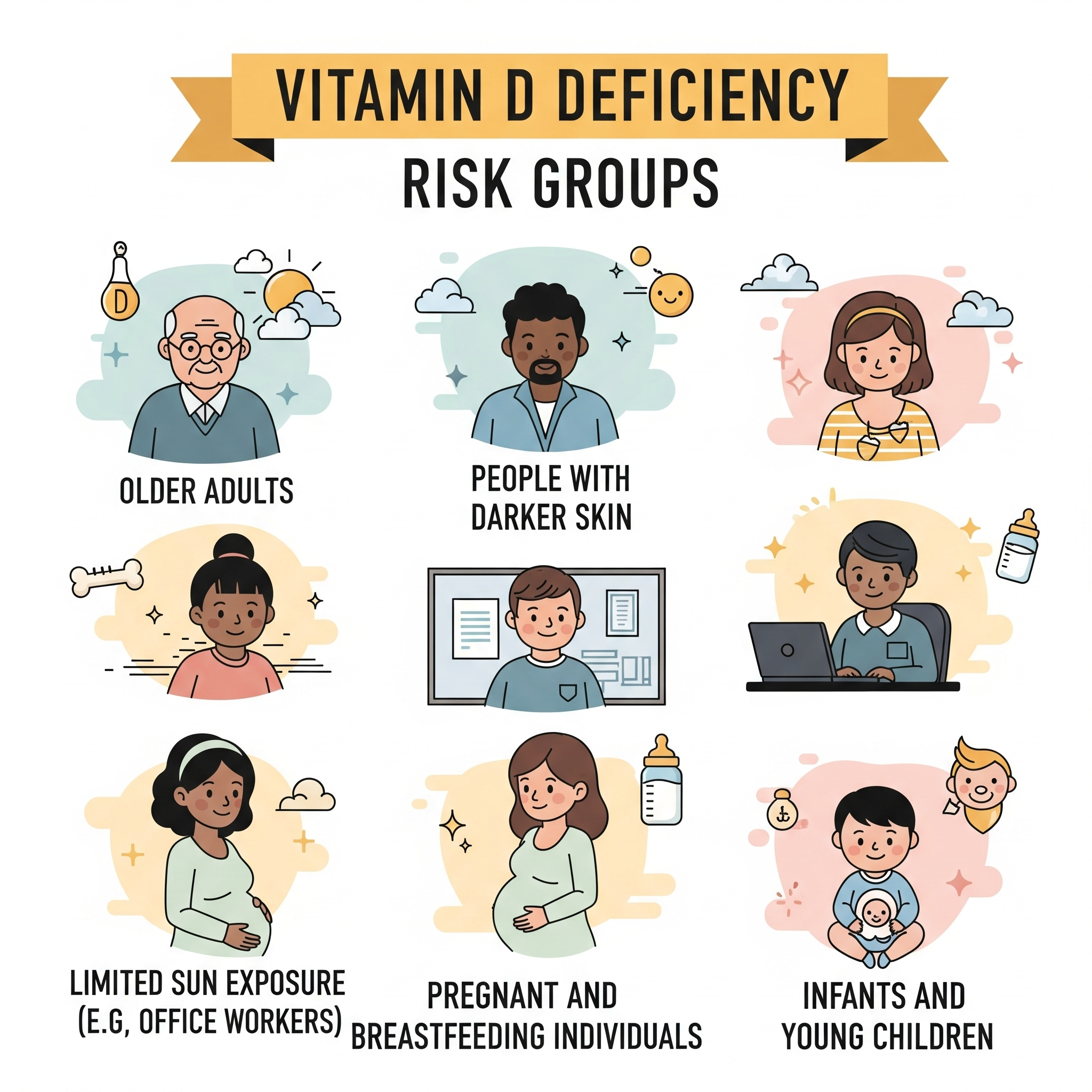 비타민D 부족 증상은 특히 다음과 같은 위험군에서 자주 나타납니다.