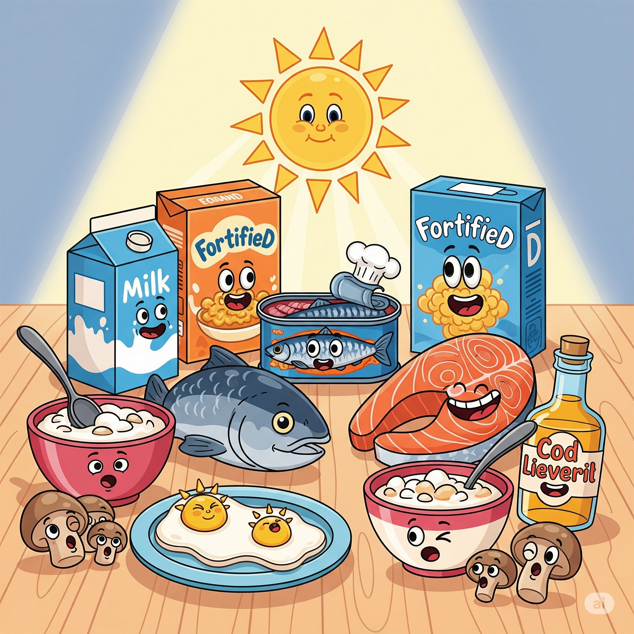 비타민 D 풍부한 음식으로는 지방이 많은 생선(연어, 고등어, 참치), 달걀 노른자, 간, 버섯(특히 표고버섯과 양송이버섯) 등이 있습니다. 우유·두유·시리얼·오렌지 주스 등 비타민 D가 강화된 가공식품도 좋은 보충원입니다.
