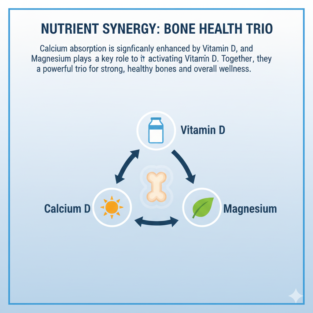 - 칼슘 + 비타민D + 마그네슘: 뼈 건강 3총사로 서로의 흡수율을 높입니다.