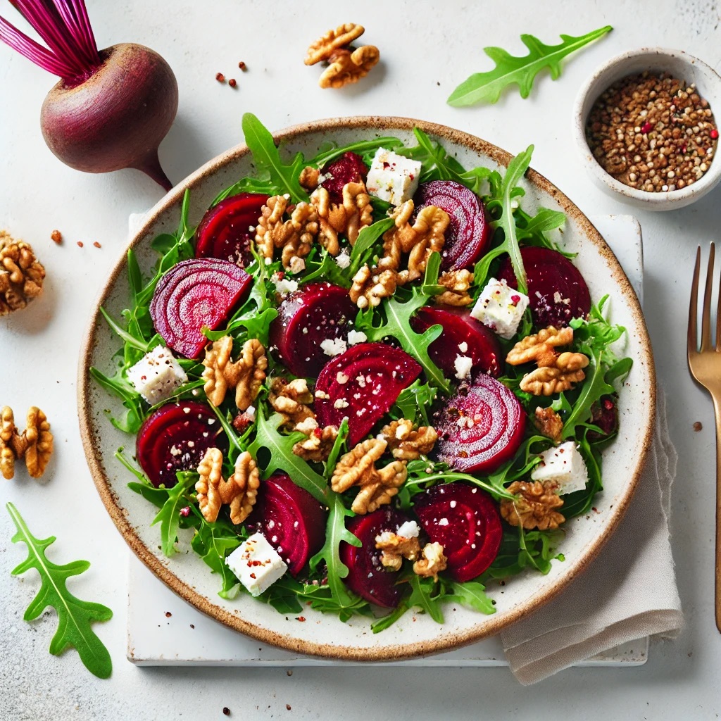 - 샐러드 그릇에 루꼴라 또는 시금치를 깔고, 비트와 구운 호두를 올린다.