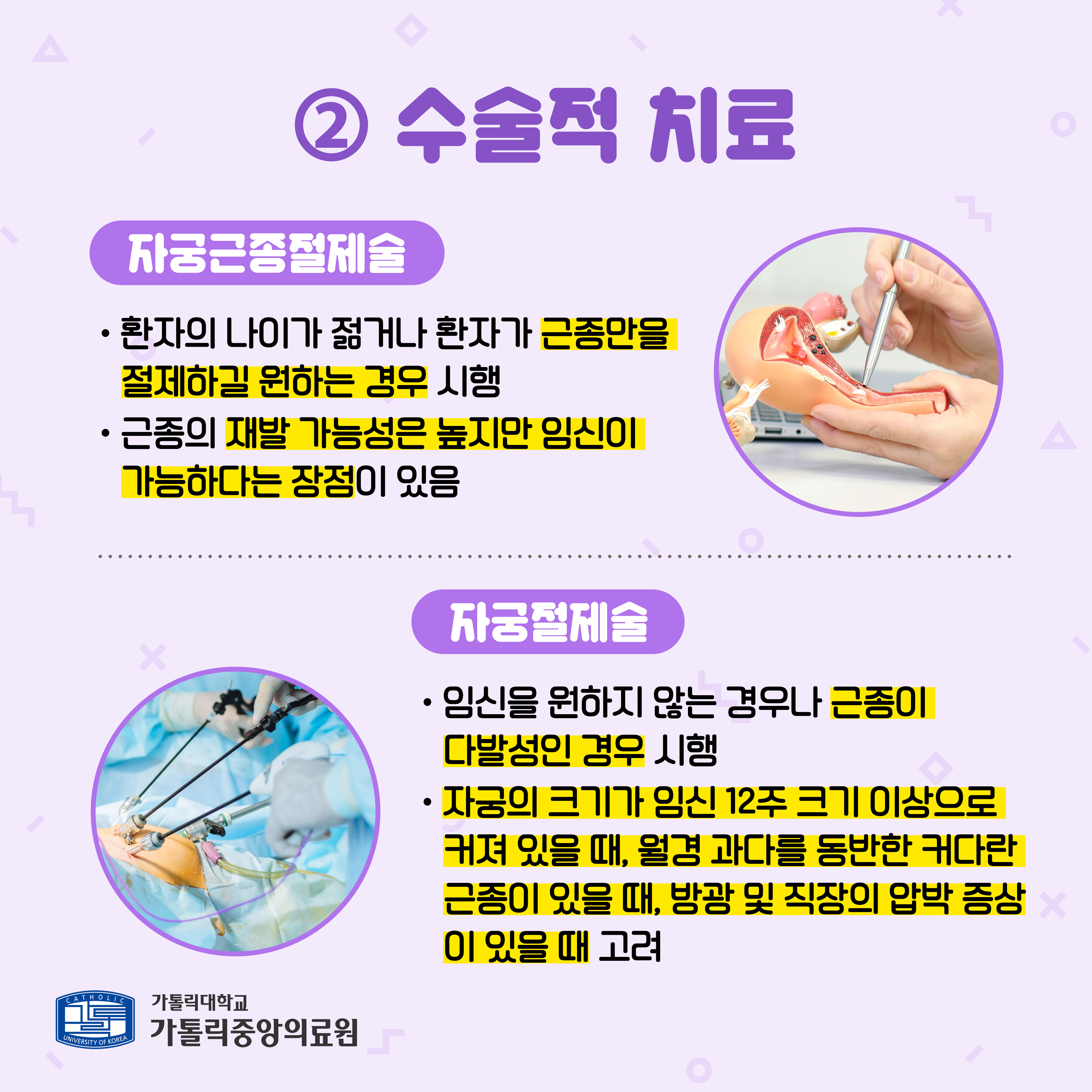자궁근종 절제술: 자궁을 보존하면서 근종만 제거하는 방법입니다.