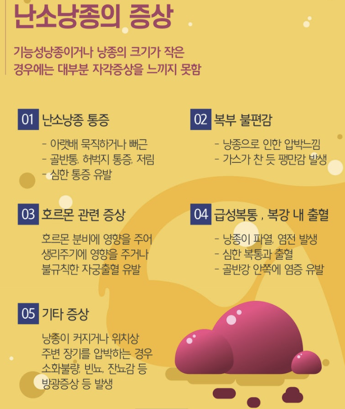 - 수술: 낭종이 크거나 악성 의심이 있는 경우, 복강경 수술 등을 통해 제거할 수 있습니다.