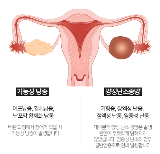 - 황체낭종: 배란 후 남은 조직이 액체로 채워져 형성됩니다.