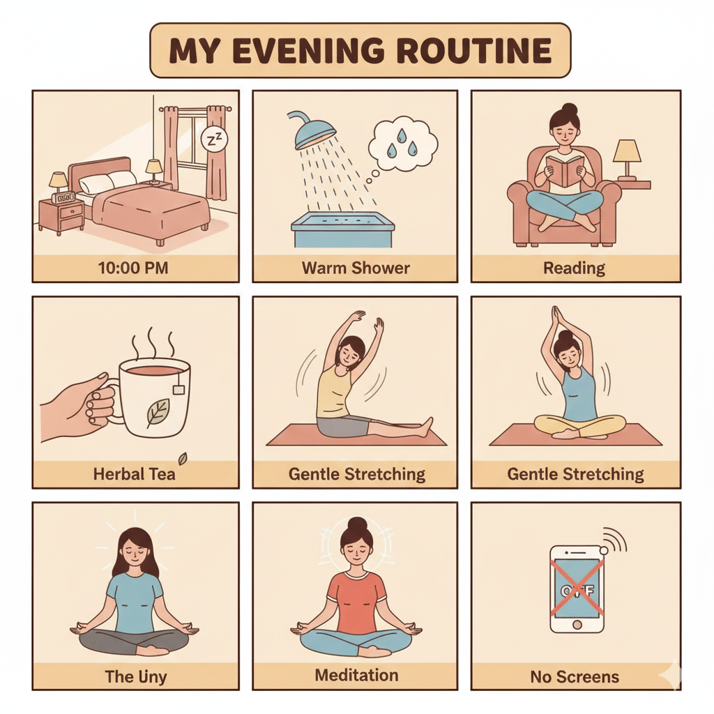 - 행동 지침: 잠자리에 들기 1시간 전쯤부터 미지근한 물로 샤워하거나, 따뜻한 허브차(카페인 없는)를 마시거나, 잔잔한 음악을 듣거나, 가벼운 스트레칭을 하는 등 자신만의 이완 의식을 만듭니다.