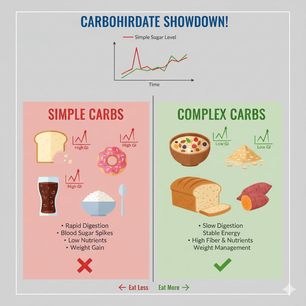 모든 탄수화물이 같은 것은 아닙니다. 탄수화물은 구조에 따라 '단순' 또는 '복합'으로 나뉩니다. 이 구조적 차이가 우리 몸의 혈당과 에너지 수준에 결정적인 영향을 미칩니다.