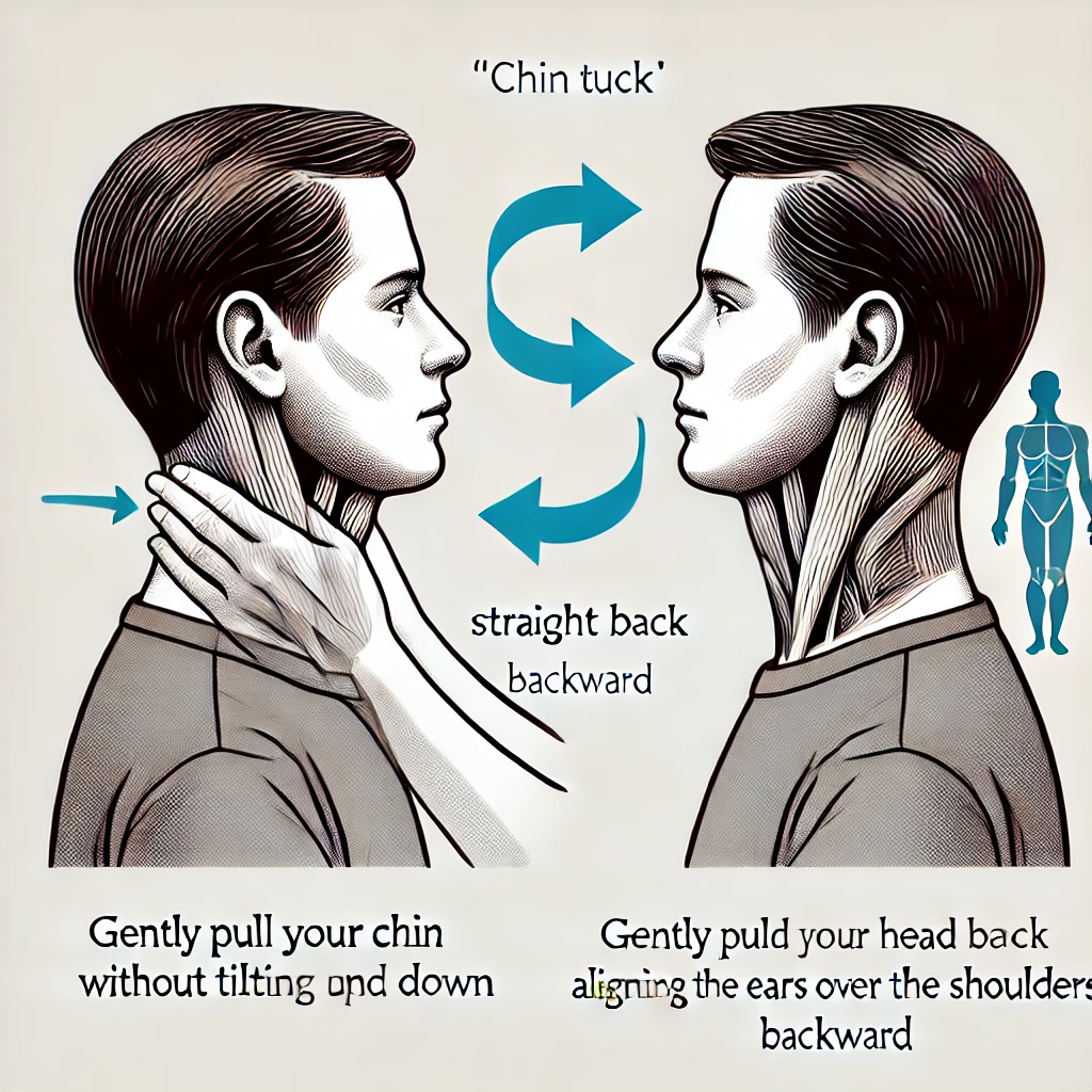 - 정면을 보고 턱을 ‘뒤로 당긴다’는 느낌으로 5초간 유지합니다.