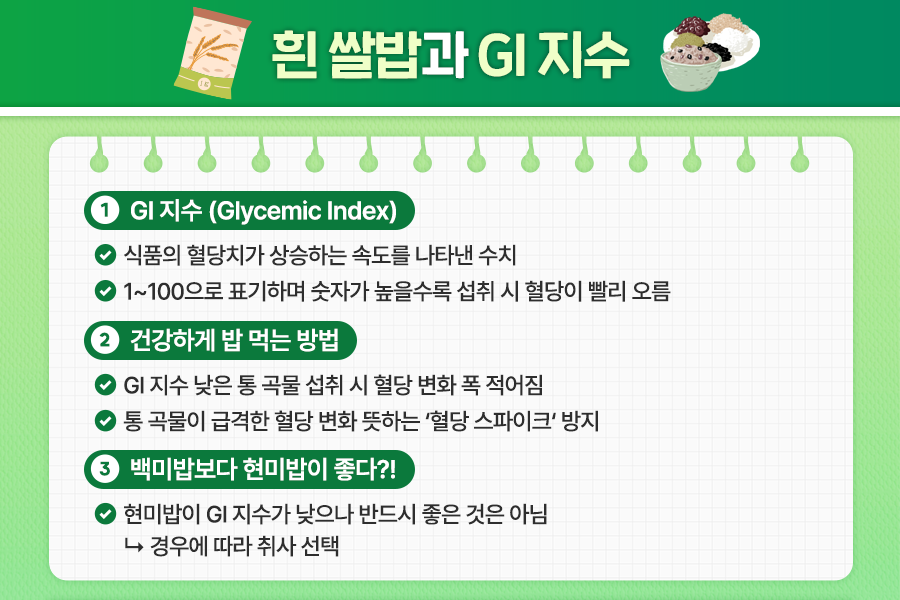 - 흰쌀밥의 GI는 약 70~90으로 높은 편입니다. 이는 섭취 후 혈당이 빠르게 상승한다는 것을 의미하며, 다이어트 중인 사람이나 당뇨 환자에게는 주의가 필요합니다. 하지만 몇 가지 방법을 통해 흰쌀밥을 건강하게 섭취할 수 있습니다.