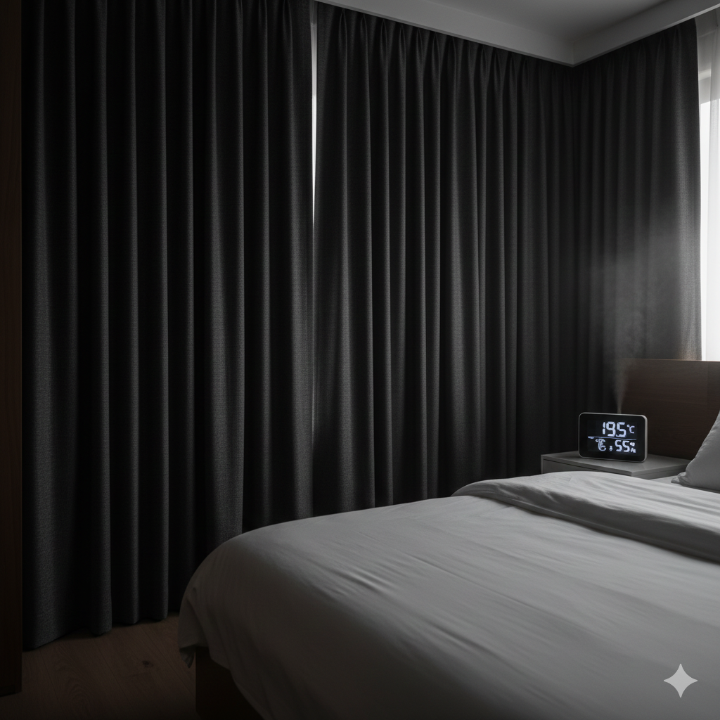 - 어두움 (Dark): 모든 빛(특히 블루라이트)을 완전히 차단해야 멜라토닌 분비가 원활해집니다. 암막 커튼을 사용하고, 작은 전자 기기의 불빛도 가립니다.