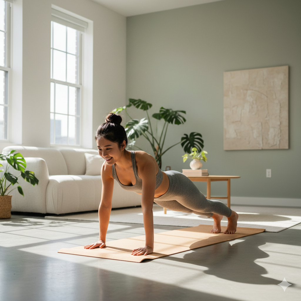 실천 팁: 층간 소음이 걱정된다면, 무릎 높이뛰기 대신 제자리에서 **'빠르게 걷기'**나 **'와이드 스쿼트'**로 대체하고, 매트 위에서 동작을 수행합니다.