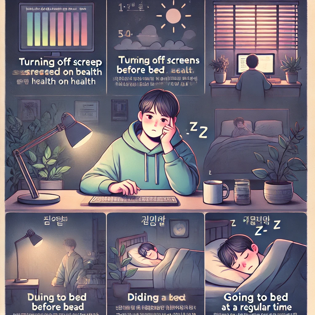 - 잠들기 1시간 전부터는 수면 준비 루틴(조명 줄이기, 전자기기 off 등) 실행