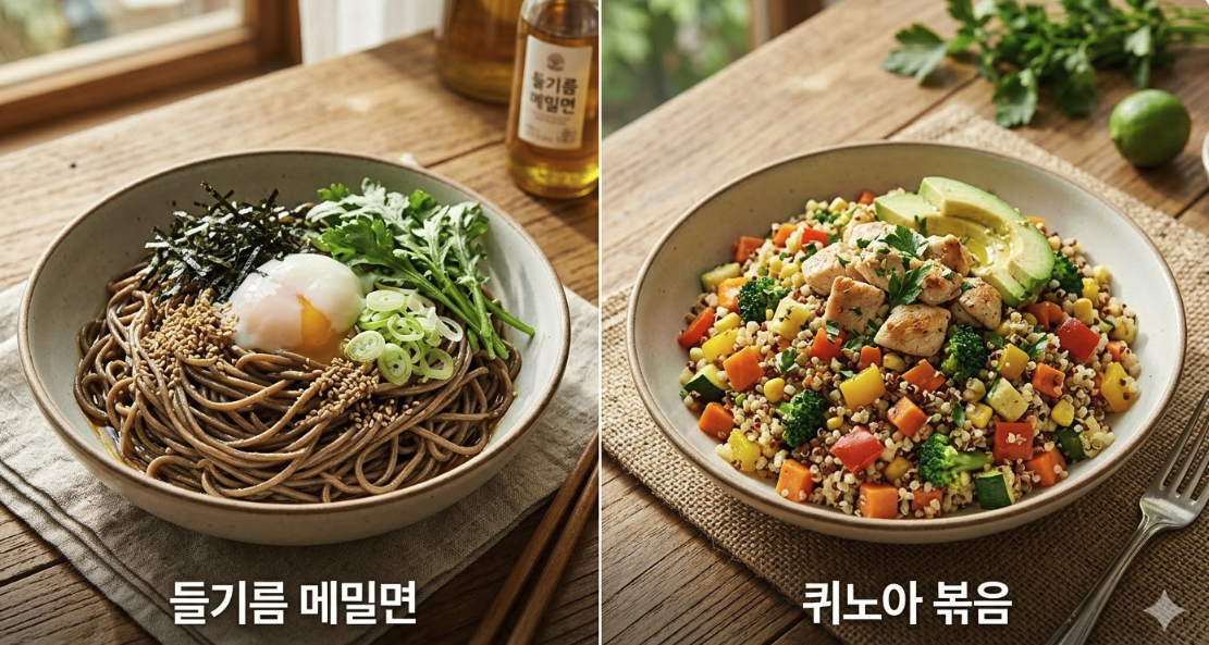 - 레시피: 삶은 메밀면 위에 부드러운 닭안심을 찢어 올리고 들기름을 듬뿍 두릅니다. 저속노화 식단 중 가장 '맛있는' 한 끼가 될 것입니다.