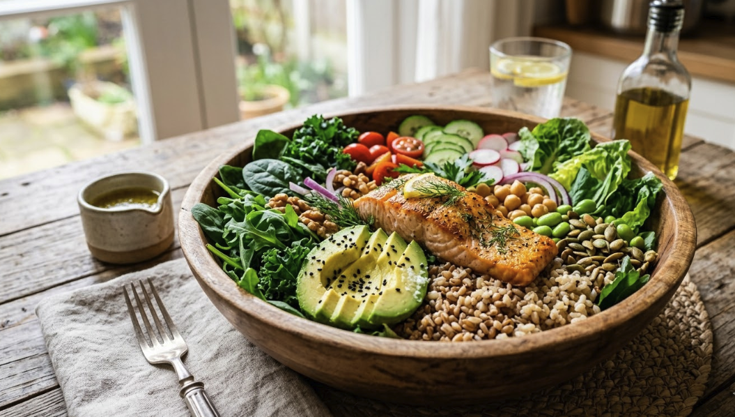 저속노화 식단의 핵심은 '혈당 곡선을 완만하게 만드는 것'입니다. 식이섬유가 풍부한 통곡물과 채소, 그리고 근육 소실을 막아주는 양질의 단백질을 최우선으로 섭취하는 것이 2026년 웰니스 트렌드의 정석입니다.