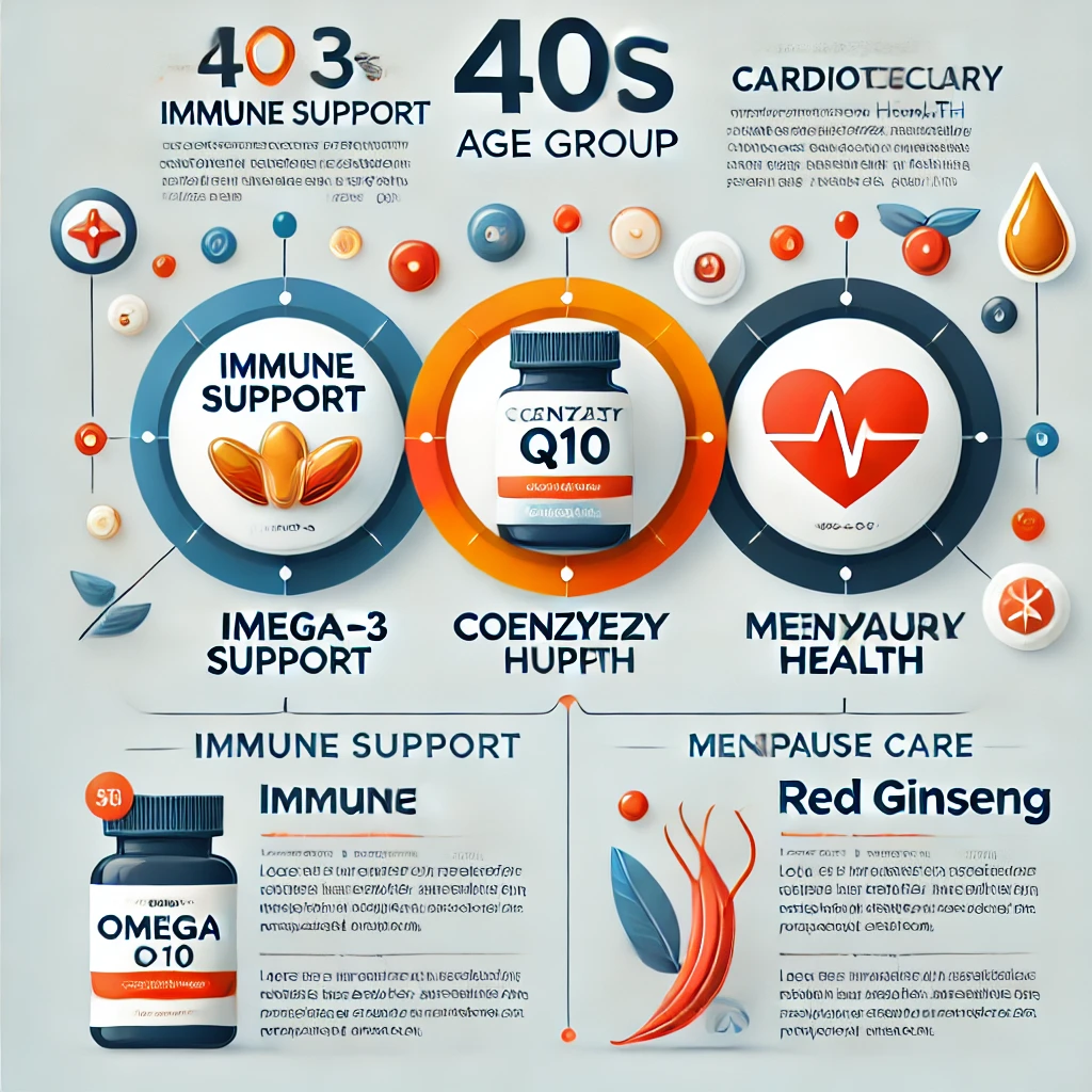 40대는 신체적 변화가 본격화되는 시기입니다. 호르몬 밸런스의 변화, 기초 대사율 감소, 면역력 저하, 혈압 변화 등 다양한 문제가 나타날 수 있으며, 이를 예방하고 관리하기 위해 영양제 선택이 중요합니다.